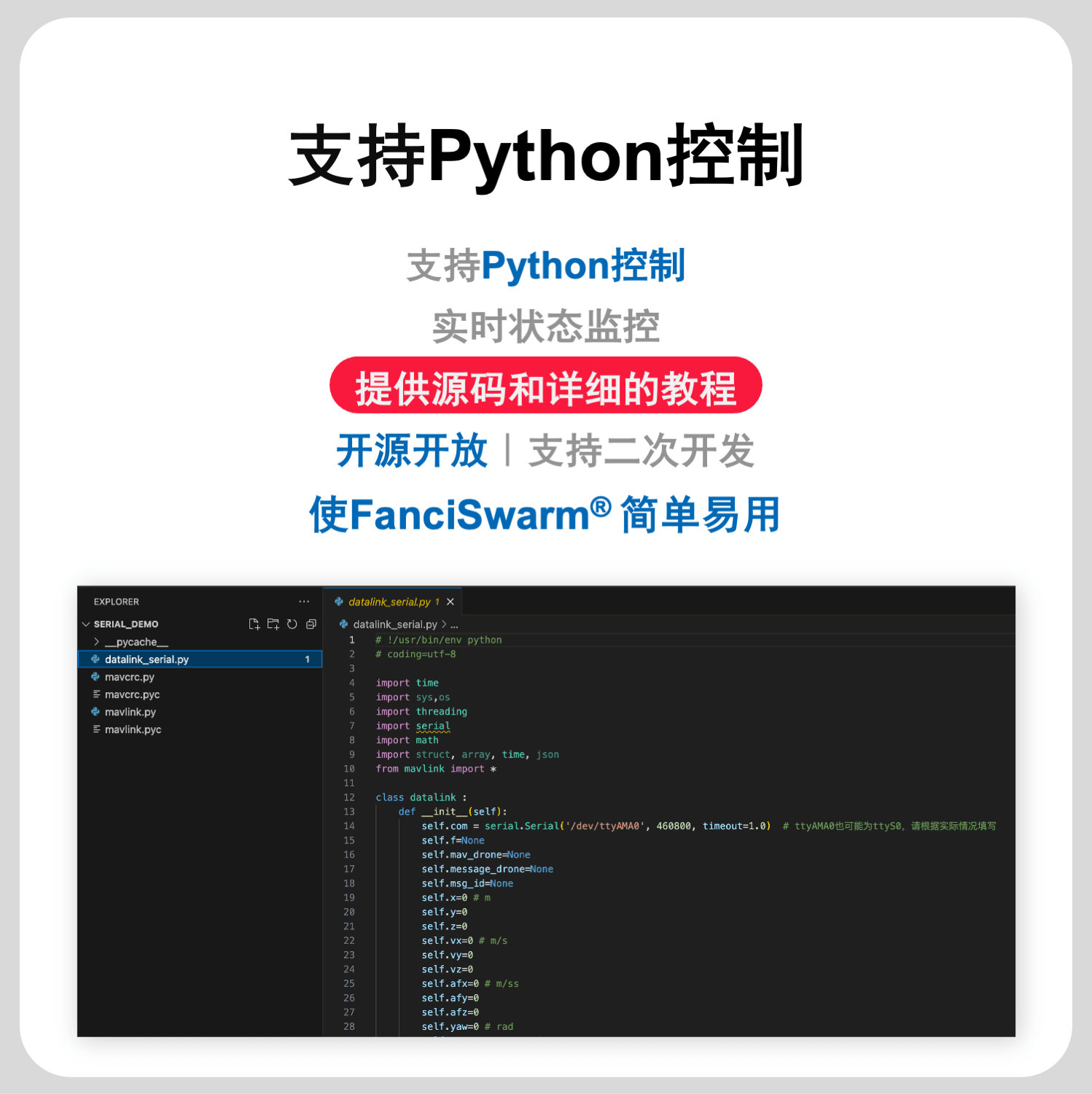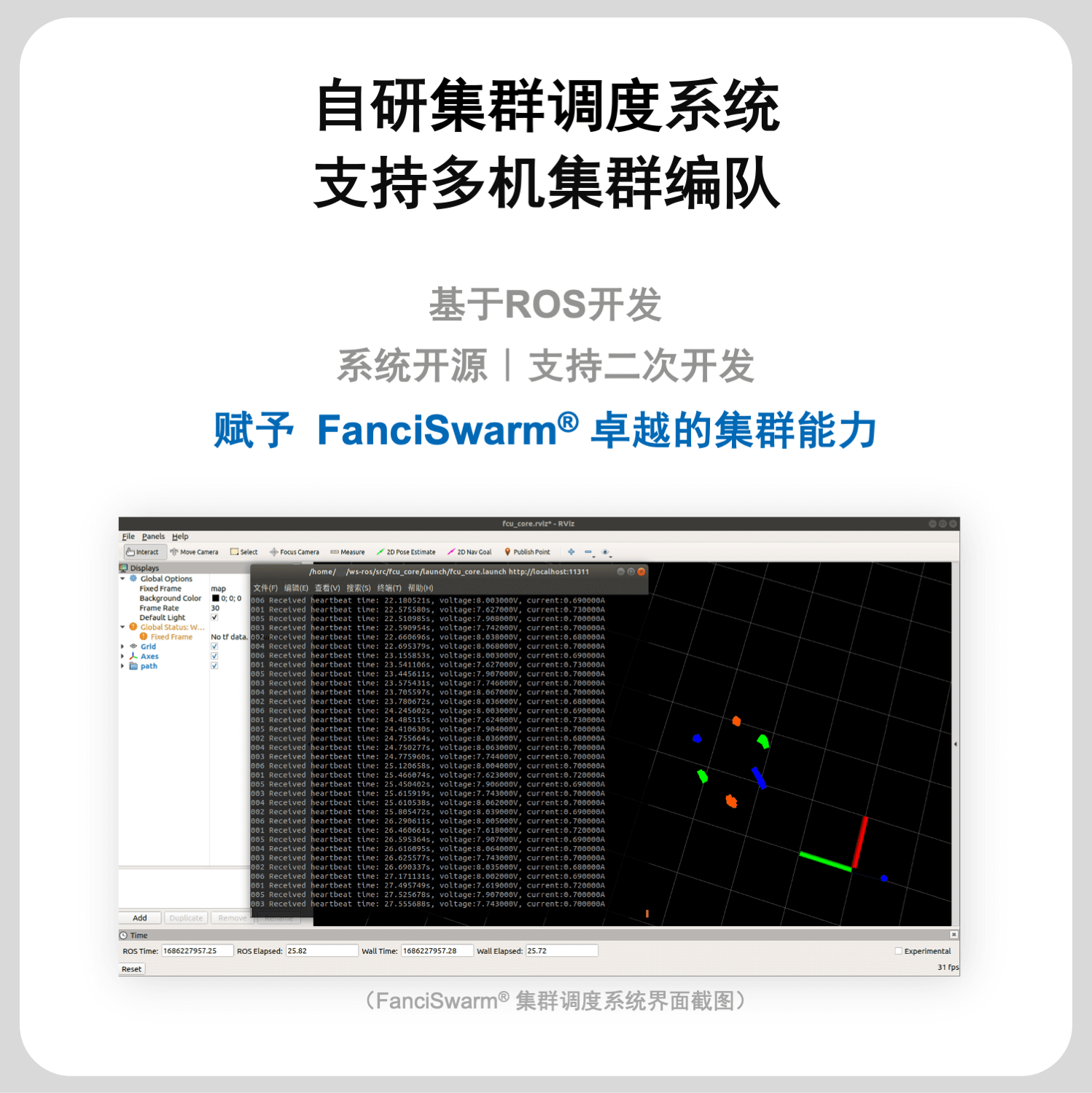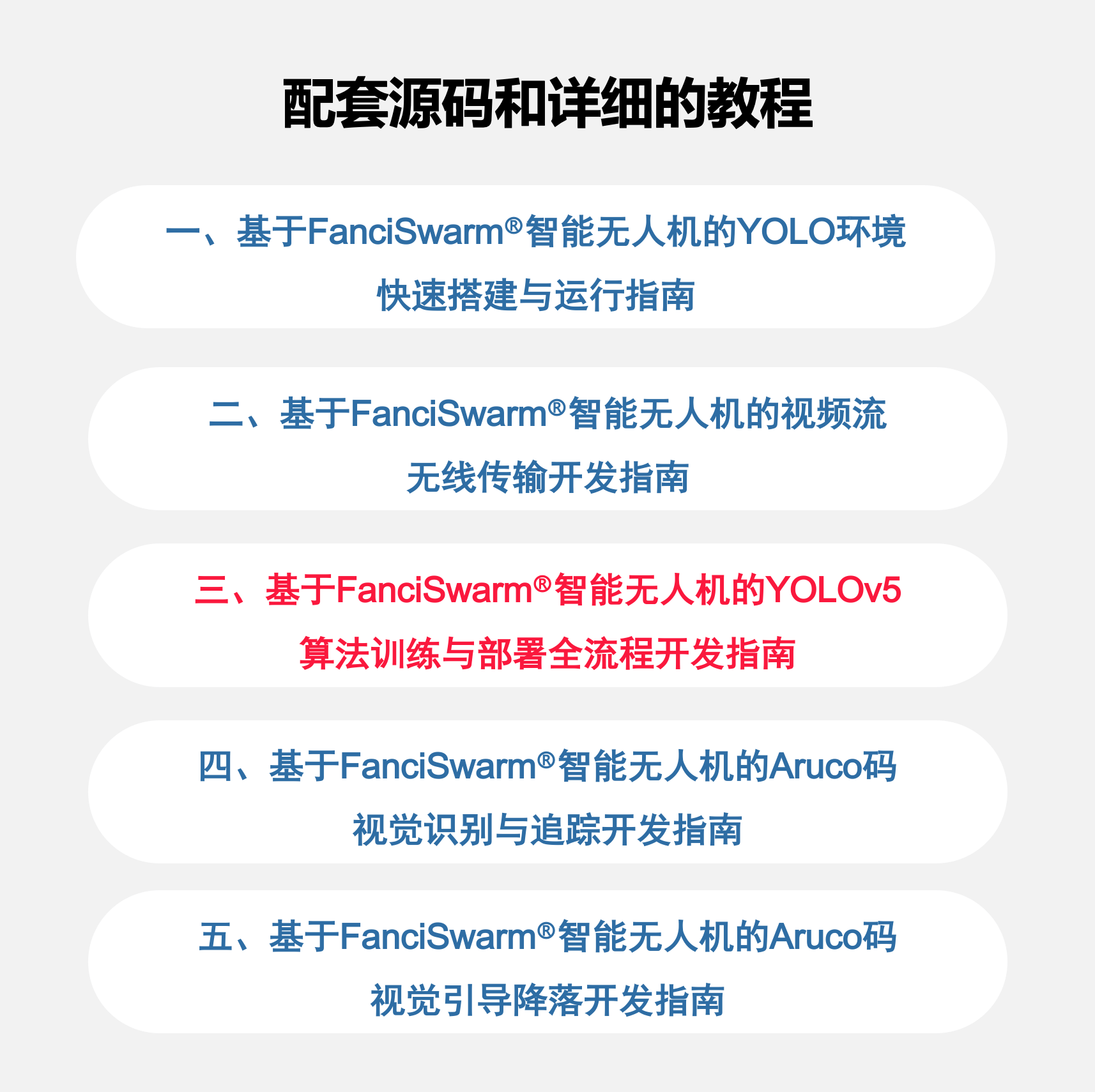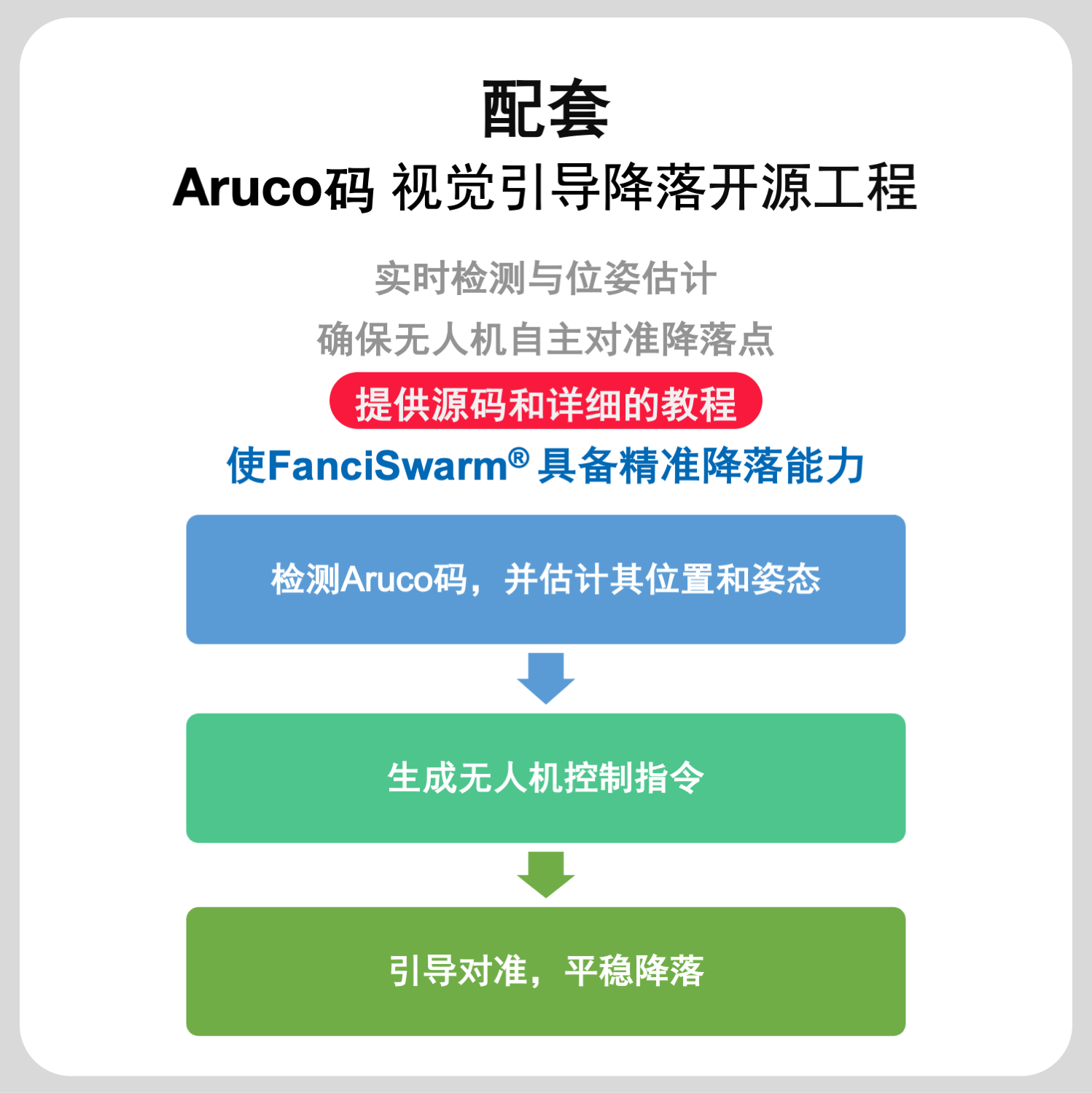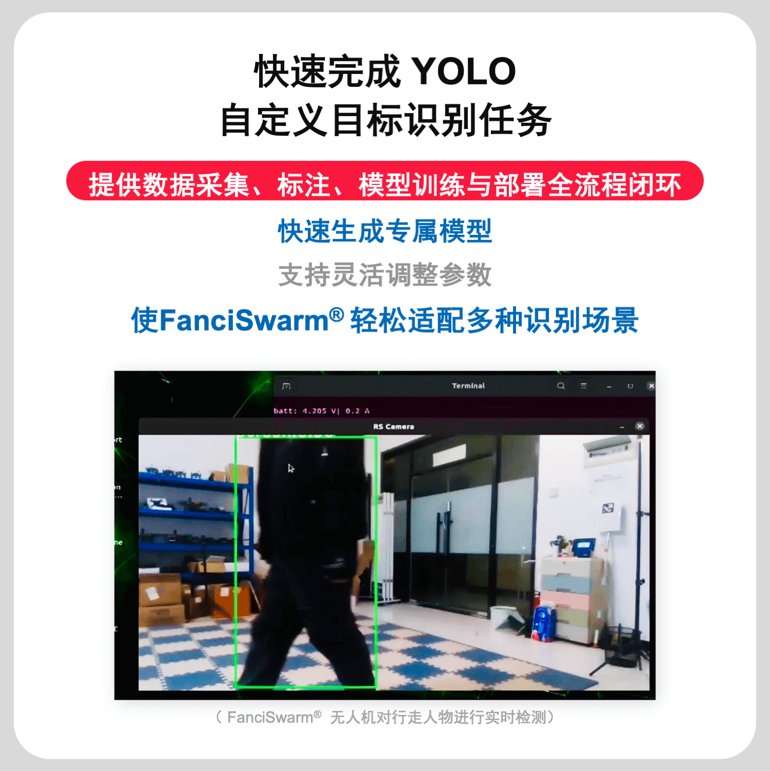 FanciSwarm® 单目视觉套件预装 Ubuntu20.04 和 ROS Noetic,开箱即用,省时高效;配套 YOLO环境快速搭建与运行指南、视频流无线传输开发指南、YOLO 算法训练与部署全流程开发指南、Aruco码视觉识别与追踪开发指南、Aruco码视觉引导降落开发指南,实时识别并精准跟踪移动目标,助力 FanciSwarm® 精准执行任务;配套自研的 FanciSwarm® 集群调度系统,赋予无人机卓越的集群协同能力......这些技术的结合,为用户提供了一个灵活、高度集成且易于扩展的平台,以实现更高级的无人机应用和研究。