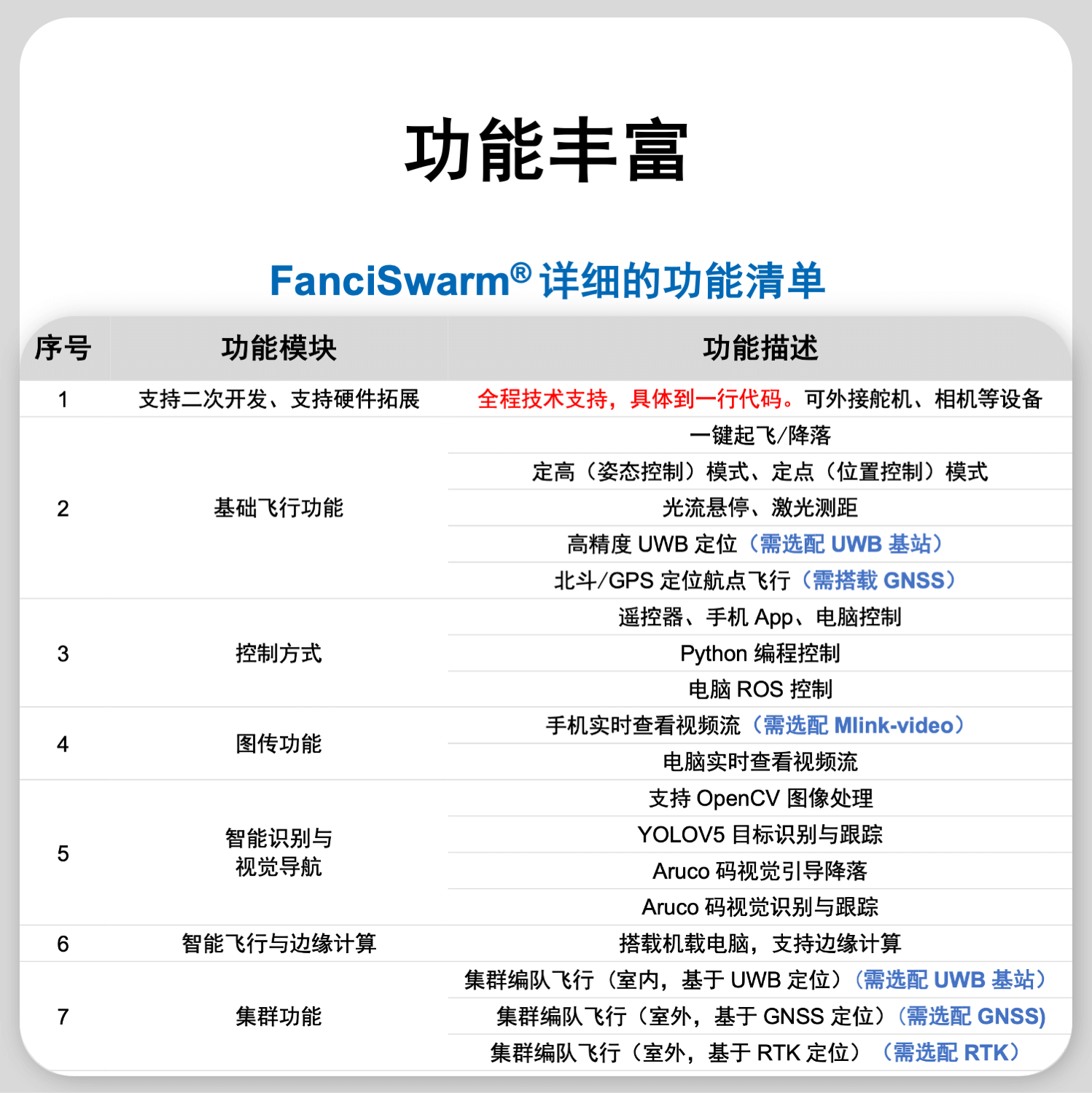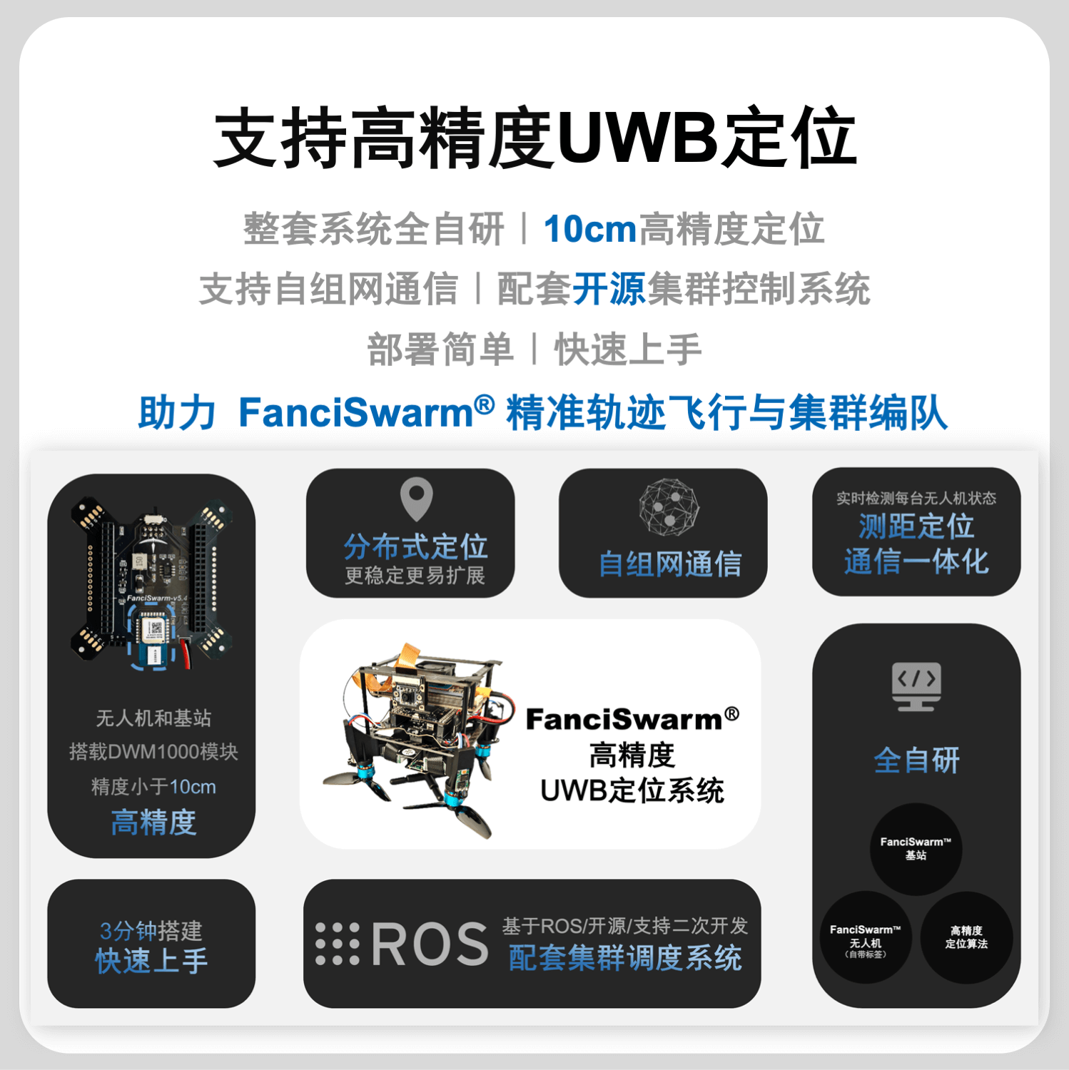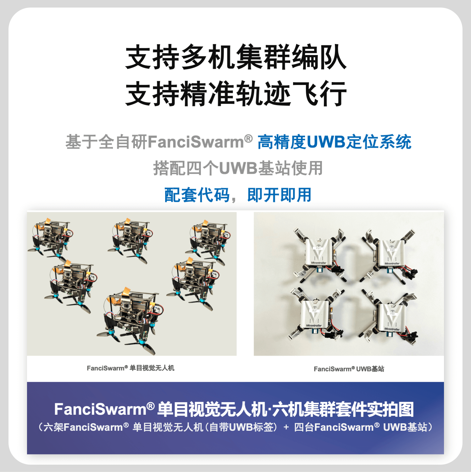 作用:FanciSwarm® 单目视觉套件,通过深度融合 Jetson Orin 的强大计算能力和 单目相机的环境感知能力,可实现图像识别、目标检测与跟踪、Aruco 码视觉引导精准降落、高精度导航与视觉定位(需选配深度相机)、视觉避障(需选配深度相机)、复杂场景下的路径规划和自主飞行(需选配深度相机)等功能,可胜任智能巡检、智能跟随、环境监测等多种应用场景。 此外, 搭配四个UWB基站,可实现高精度UWB定位,支持多机轨迹飞行、编队飞行和集群飞行。