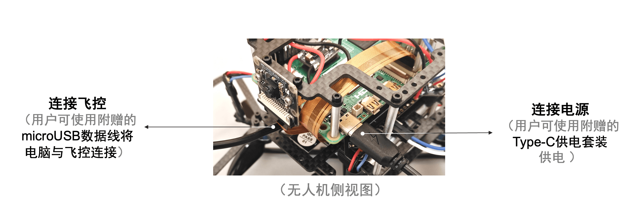 注:无人机静态调试时,请用USB线为飞控供电,切勿用无人机电池供电,防止电池过放,如下图所示: