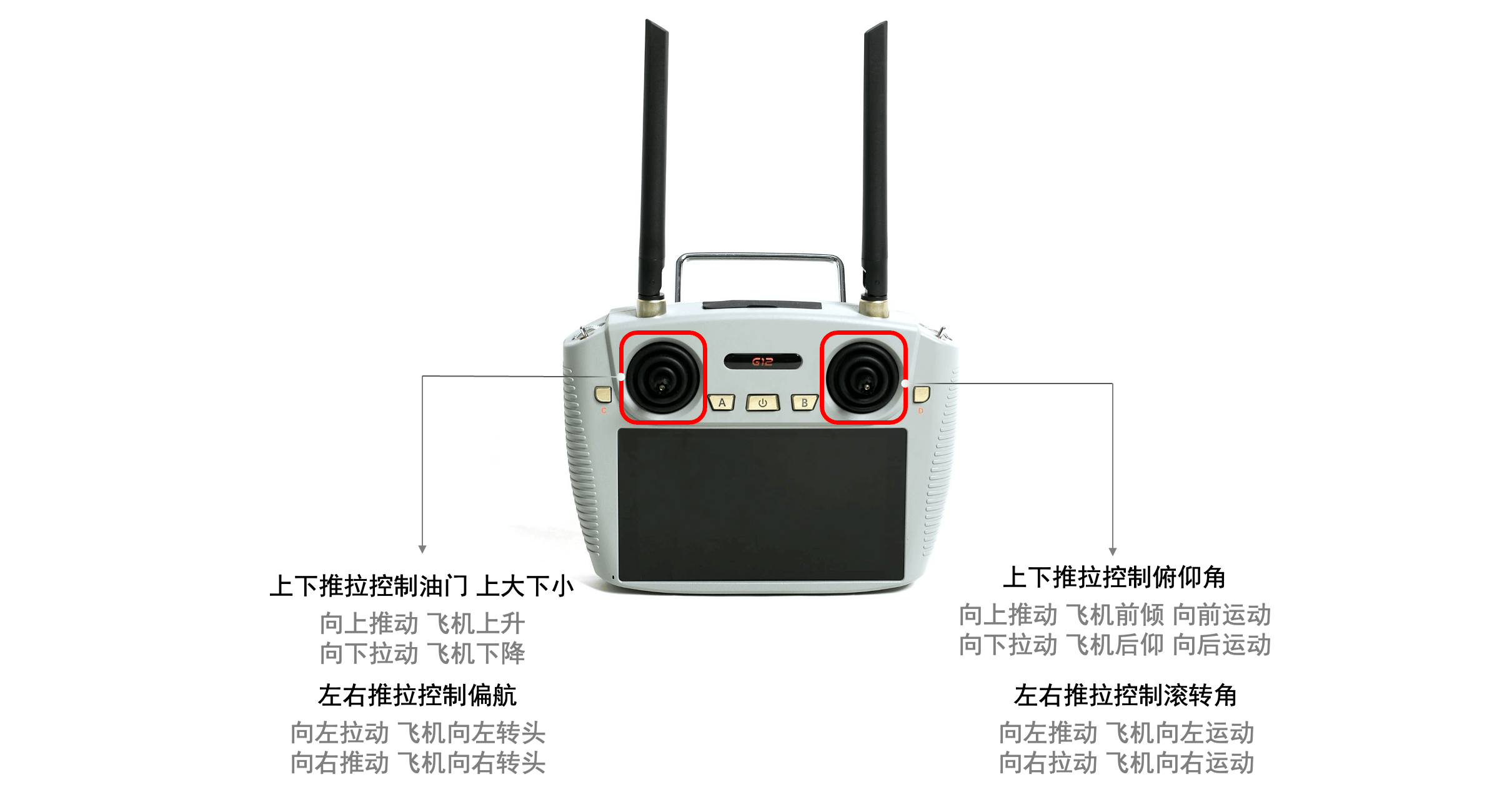 (1)在体感控制关闭的情况下,用户可通过四通道摇杆操控 FanciSwarm® Pro 无人机飞行,详细的摇杆操控说明请参见 快速入门指南——FanciSwarm® Pro 飞行——使用App飞行 一节;