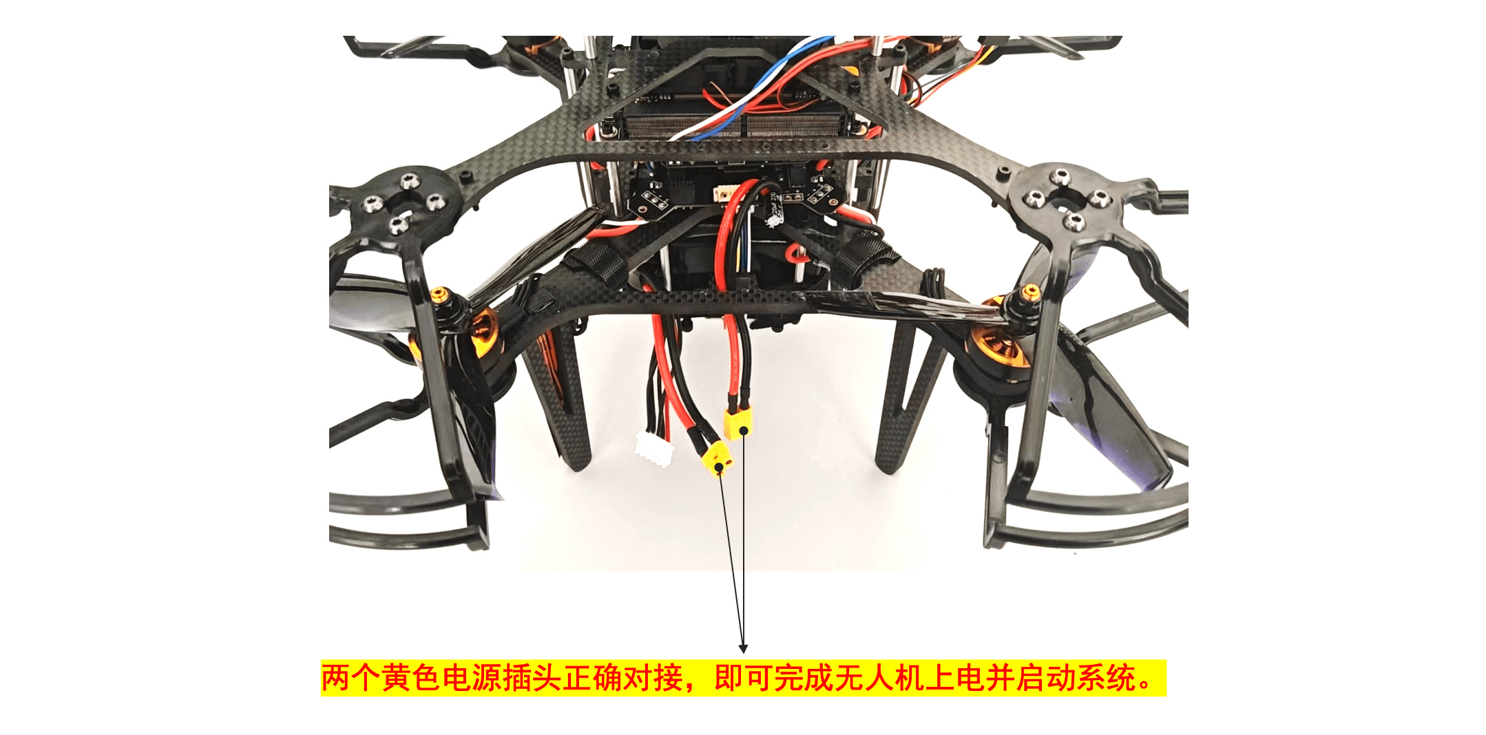 飞行供电采用无人机电池供电。将下图所示的两个黄色电源插头正确对接,即可完成无人机上电并启动系统。
