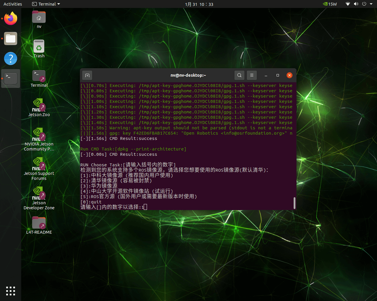 - 添加ROS源,这里直接选择中科大ROS源(经测试比较稳定)